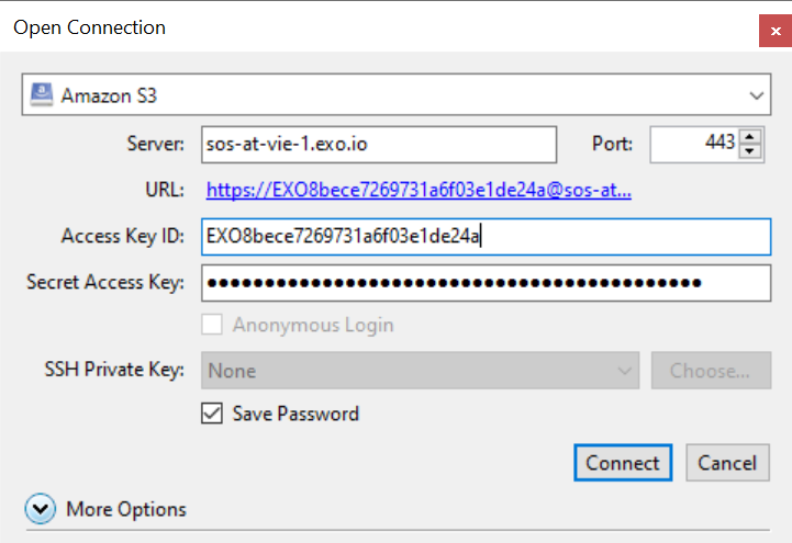 Add your Exoscale API key and secret. Then click Connect.
