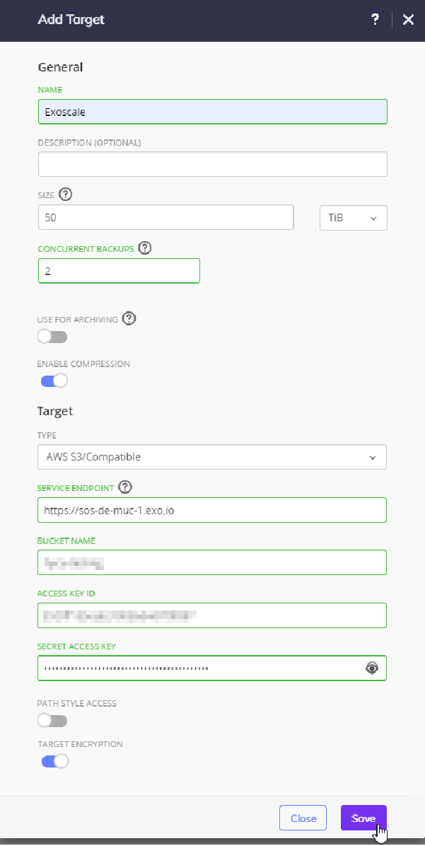 Select the AWS S3/Compatible type and enter the service endpoint (Such as https://sos-de-muc-1.exo.io).