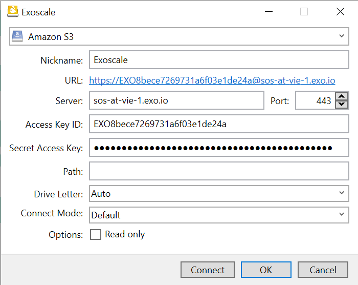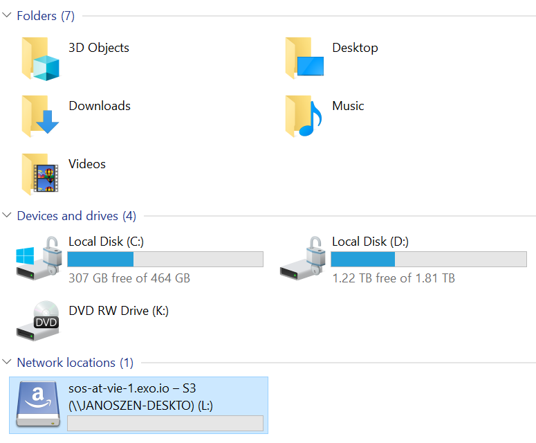Exoscale Simple Object Storage is now visible in the Explorer as a drive.