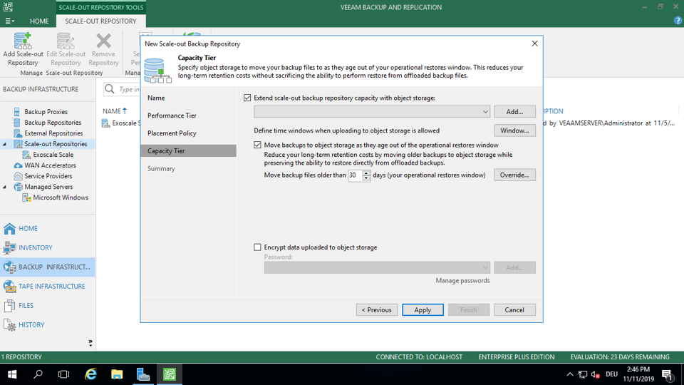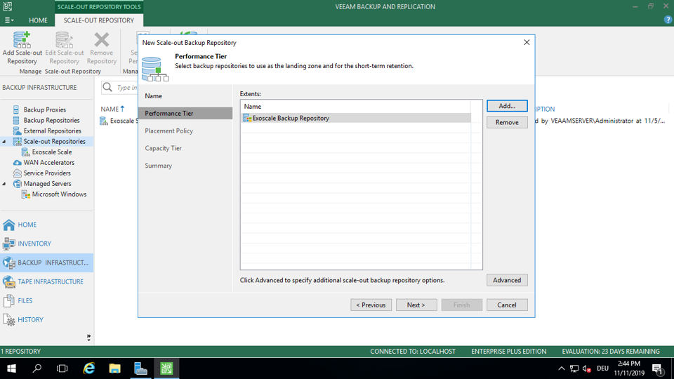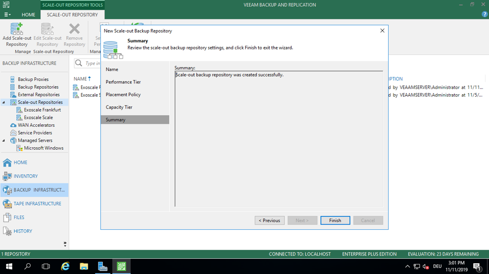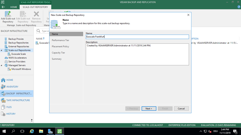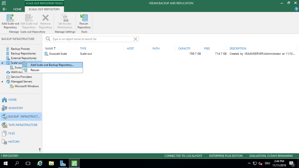 If you have already set up your Veeam backups, click Scale Out Repositories on the right side of the top menu, then Add Scale-out Backup Repository.