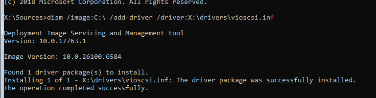 dism /image:C:\ /add-driver /driver:X:\drivers\vioscsi.inf