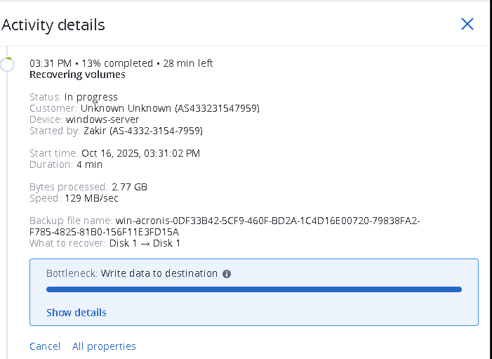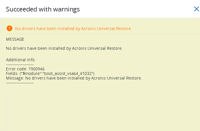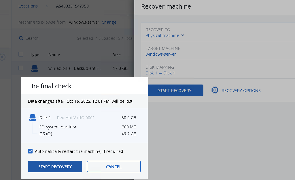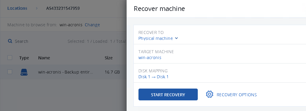 - Note: If your original system has two partitions, Disk2 of the existing server will be restored in one of the next steps, skip the message in the Acronis portal which indicates this.