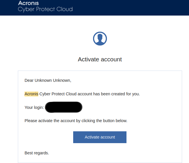 After a few minutes, you will receive a mail that contains your login and activate Acronis account option.